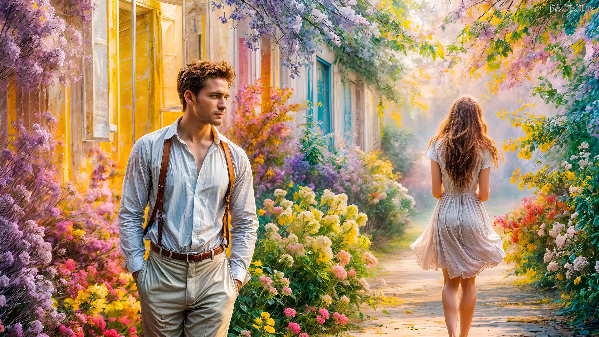 Grafika, Ogród, Kobieta, Mężczyzna, Ścieżka, Domy - faceci.biz